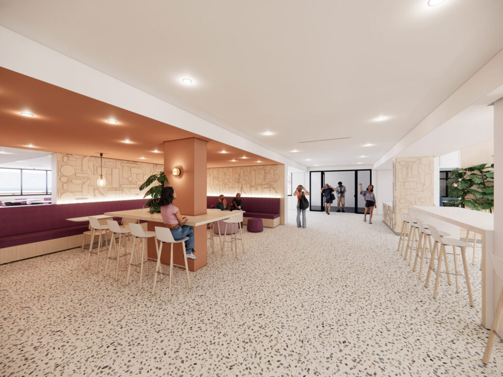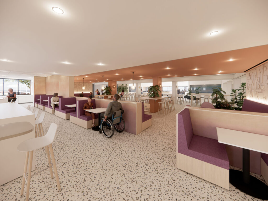 There will be new skylights bringing natural light into the main dining area. A warmer palette of natural colors and wood finishes—driven directly by student feedback. A new entrance that improves flow and arrival.